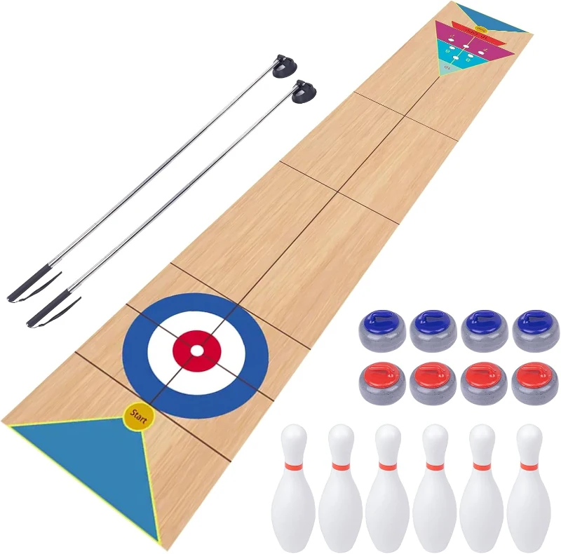 Complete Game Kit: Comes with a generous accessory bundle including an 11.8-foot 3-in-1 game mat, two pusher cues, eight curling rocks and six bowling pins for varied gameplay. Three Modes in One Mat: The single mat supports shuffleboard, curling and bowling play; mat dimensions are 11.8' L x 1.9' W to accommodate full-range movement for adults and children. Portable & Space-Saving: Rolls up for compact storage and easy transport so you can take the game anywhere. Cues & Accessories: 37.4"" pusher cues help propel the curling rocks; the included rocks and pins deliver diverse play experiences. Ideal Gift: A versatile present for birthdays, Christmas and family gatherings.