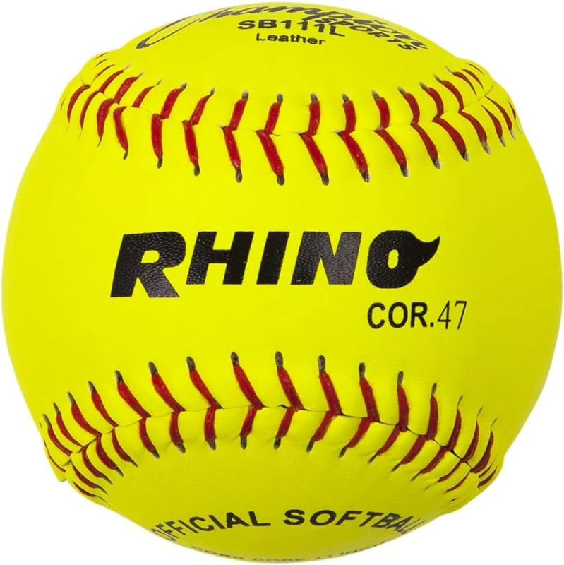 Packaged by the dozen: twelve optic-yellow leather softballs with elevated seams and red stitching for a classic look and improved handling; Ideal for both practice and competition: designed to support drills, casual recreational games, and organized play while maintaining dependable feel and flight; High-visibility rhino leather cover: tough leather construction provides longevity and an authentic tactile response; Bright yellow coloration makes the ball easy to track on the field or in the air; .47 cork core with medium compression: the cork-centered design and medium compression rating pair well with many bat types to produce consistent results; Raised-seam construction: prominent seams and red stitchwork allow firmer grip and enhanced throwing accuracy