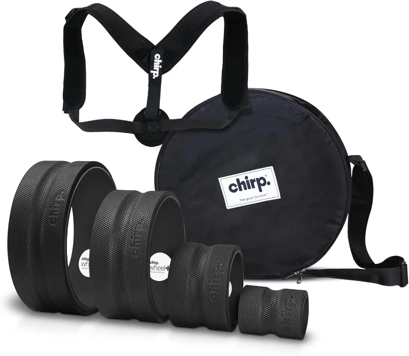 Chirp Ultimate Back + Neck Bundle — 4-Pack Massage Wheels (12-inch Gentle, 10-inch Firm, 6-inch Deep Tissue, 4-inch Focus), Upper Back Posture Corrector, Carrying Case, High-Density Foam Rollers, Supports up to 500 lbs, Black(m-1)