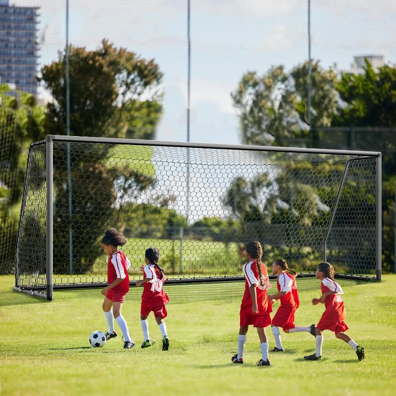 Available in a range of sizes (6x4 / 8x6 / 10x6.5 / 12x6 / 16x7 / 18.5x6.5 / 21x7 / 24x8 ft) to suit youth squads, clubs, schools, or adult practice sessions for realistic skill development and match simulation; Robust 66mm heavy-duty aluminum frame made from thick, rust-resistant tubing to resist high-impact shots and everyday training while delivering professional durability; All-weather construction with sturdy netting and frame design engineered to perform reliably in sun, rain, or windy conditions for outdoor use; Secure setup with included ground stakes and net clips for quick installation and to keep the goal stable during drills, scrimmages, and powerful strikes; Preferred by coaches and clubs as a dependable training asset, built for repeated use in structured or competitive practice environments.