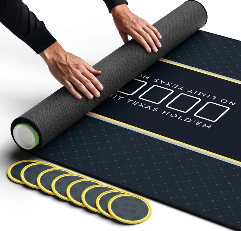 Tailored for standard folding tables - The 70"" x 30"" dimensions fit 6-foot and 8-foot tables (30"" width), delivering a neat, professional playing area for home games; Enhanced focus with black playfield - The black tabletop with a bright central outline improves visibility and comfort for extended sessions while adding a refined look to your game nights; Party-capable size - Designed to accommodate up to 10 players, ideal for weekend gatherings and holiday play; Easy-pack zipper carry bag - A horizontal zipper bag allows effortless rolling and storage without cumbersome stuffing; Coasters and poker reference cards - Equipped with 8 coasters to protect the mat from drink rings and 8 insert cards that show poker hand rankings for quick, phone-free consultation; Gift-ready presentation - Packaged in an attractive gift box, perfect for gifting on birthdays, Christmas, New Year or other occasions; Durable, wipe-clean build - Features a non-slip rubber backing and polyester surface for reliable card handling and easy maintenance; Long-lasting rolling tube - Use the included tube to roll and store the mat after use to avoid creases and warped edges.