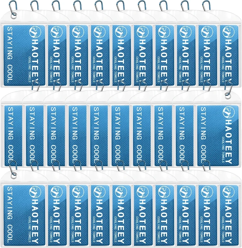 All-day cooling: These evaporative towels draw moisture from the skin to lower body temperature. Just immerse, squeeze, and flick the fabric to activate a rapid cooling effect that lasts for hours during workouts, outdoor activities, and hot-weather trips.; Multi-use design: Constructed from breathable, gentle-on-skin material safe for sensitive complexions. Use as neck wraps, shoulder or head covers for UV protection, or tie as a sweat-wicking headband—great summer gifts for athletes, travelers, kids, and seniors.; Convenient portability: Each set includes a waterproof storage pouch so towels can be carried wet or dry without mess. Pouches have a carabiner for easy attachment to backpacks, gym bags, or belts when hiking, at the beach, or gardening.; Durable construction: Reinforced edge stitching prevents fraying after repeated laundering and use. Each versatile sweat towel measures 40in x 12in and the pack contains 30 pieces for bulk needs.; Ideal for summer sports: These gym towels help reduce body heat and speed recovery after intense exercise or outdoor work, helping prevent overheating and sunburn so you and your loved ones stay comfortable.