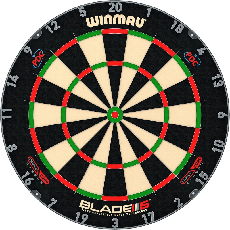 PDC endorsed: The Blade 6 Triple Core carries the official Professional Darts Corporation endorsement, now used by the world’s top professionals. Triple Core Carbon construction: Features a patented three-layer system with a high-compression middle layer and carbon-fibre reinforced sisal for a seamless playing surface, superior fibre density, exceptional dart holding and enhanced scoring. Patent Number 2507762. Superior visibility and reduced glare: Updated graphics and the industry's first laser-cut anti-glare number ring (Patent Pending) deliver an optimal playing experience. Density Control web: Winmau’s advanced web design uses the new ‘Density Control’ wire to concentrate fibre density and improve dart retention across doubles, trebles and the bull. Ultra-thin 60° angled wire: The slim, angled wire deflects darts into scoring segments to minimize bounce-outs; hardened bull and outer bull zones with Density Control are 25% thinner. Easy mounting: Supplied with the adjustable Rota-Lock system and Spirit Master levelling tool for quick, secure installation. Premium sisal: Made from top-grade East African sisal and engineered to World Darts Federation specification for professional-level performance.