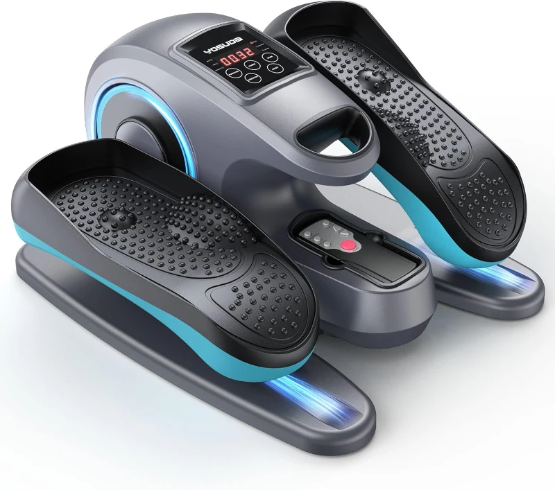 What’s included: a compact YOSUDA electric under-desk elliptical, remote control, one pair of non-slip foot straps, and multiple speed options. Backed by YOSUDA’s 20+ years in home fitness and trusted by over one million households, with 24/7 customer support. Low-impact, zero-pressure design promotes circulation, strengthens lower-body muscles and improves mobility — ideal for office workers, seniors and those undergoing leg rehabilitation. Safety note: not suitable for use with implantable electronic medical devices (e.g., pacemakers) or if you have internal surgical fixtures such as steel plates. Convenient remote operation lets you change settings without bending; features three preset 30-minute programs (P1–P3), a manual mode with 10 adjustable speeds, and forward/reverse pedaling for varied workouts while seated. Built with YOSUDA’s patented motor for quiet, smooth performance and a rubberized base to keep the unit stable so you can work or read undisturbed. Slim profile fits neatly under desks to burn calories and relieve stiffness from prolonged sitting. No assembly required — built-in handle makes it portable and easy to store; included straps help prevent foot slippage, making this unit especially suitable as a gift for seniors or those with limited mobility. Simple one-button start and easy mode switching via the LCD or remote; the display shows time, distance, speed, calories burned and step count in real time. Innovative anti-slip pedals with raised nodules provide shock absorption and stimulate foot circulation while enhancing joint flexibility; the bi-directional circular motion minimizes knee impact. Tip: socks or bare feet may improve comfort and sensor contact.